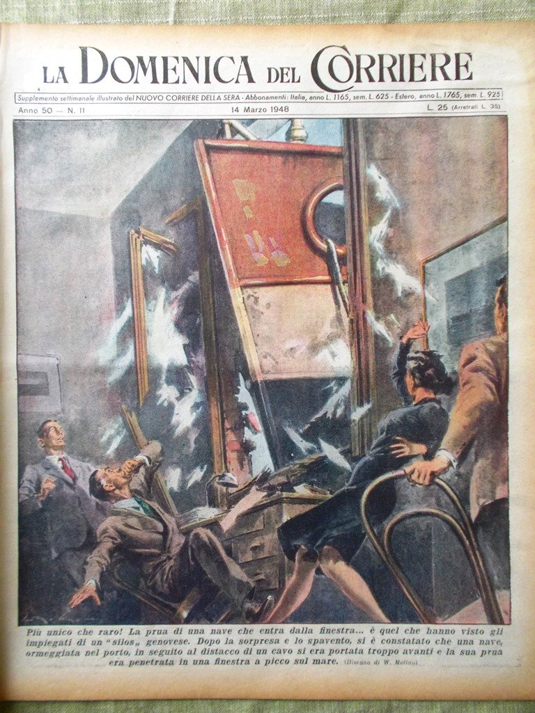 La prua di una nave che entra dalla finestra. è quel che hanno visto gli impiegato di un "silos" genovese. Dopo la sorpresa e lo spavento, si è constatato che una nave, ormeggiata nel porto, in seguito al distacco di un cavo si era portata troppo avanti e la sua prua era penetrata in una finestra a picco sul mare (Walter Molino)