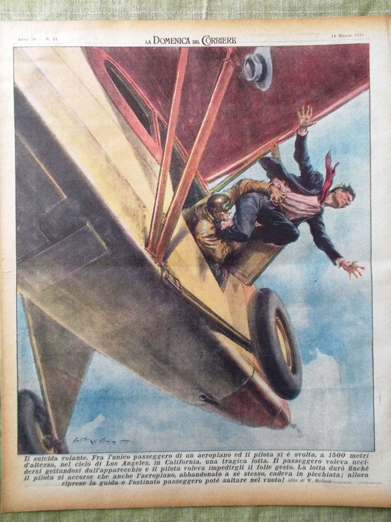 Fra l'unico passeggero di un aeroplano e il pilota si è svolta a 1500 metri d'altezza una tragica lotta. Il passeggero infatti voleva suicidarsi gettandosi dall'apparecchio e alla fine riuscì nel folle gesto (Walter Molino)