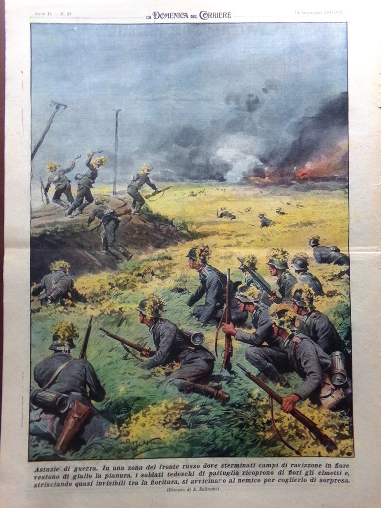 Astuzie di guerra. In una zona del fronte russo dove sterminati campi di ravizzone in fiore vestono di giallo la pianura, i soldati tedeschi di pattuglia ricoprono di fiori gli elmetti e, strisciando quasi invisibili tra la fioritura, si avvicinano al nemico per coglierlo di sorpresa (Achille Beltrame)
