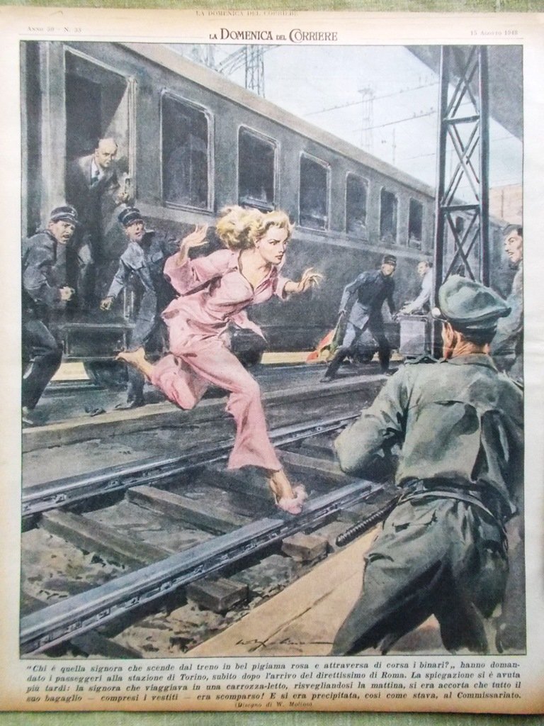 "Chi è quella signora che scende dal treno in bel pigiama rosa e attraversa i binari"? hanno domandato i passeggeri della stazione di Torino subito dopo l'arrivo del direttissimo di Roma (Walter Molino)