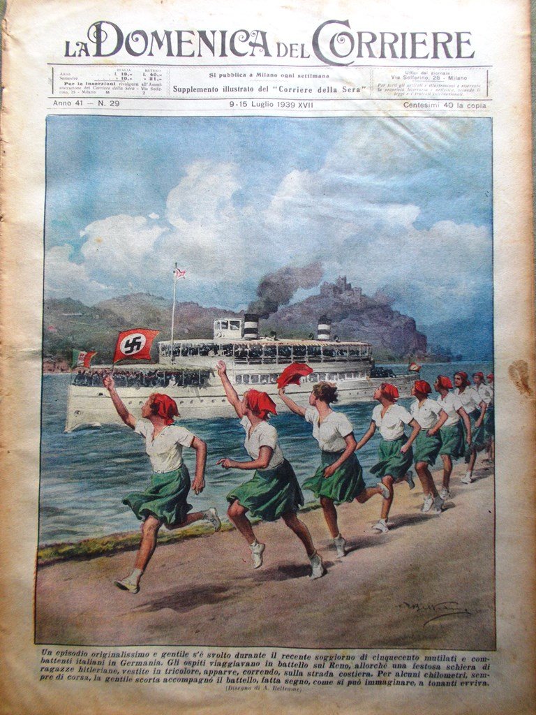 Un episodio originalissimo e gentile si è svolto durante il recente soggiorno di 500 mutilati e combattenti italiani in Germania. Gli ospiti viaggiavano in battello sul Reno quando una festosa schiera di ragazze, vestite in tricolore, apparve correndo sulla strada costiera (Achille Beltrame)