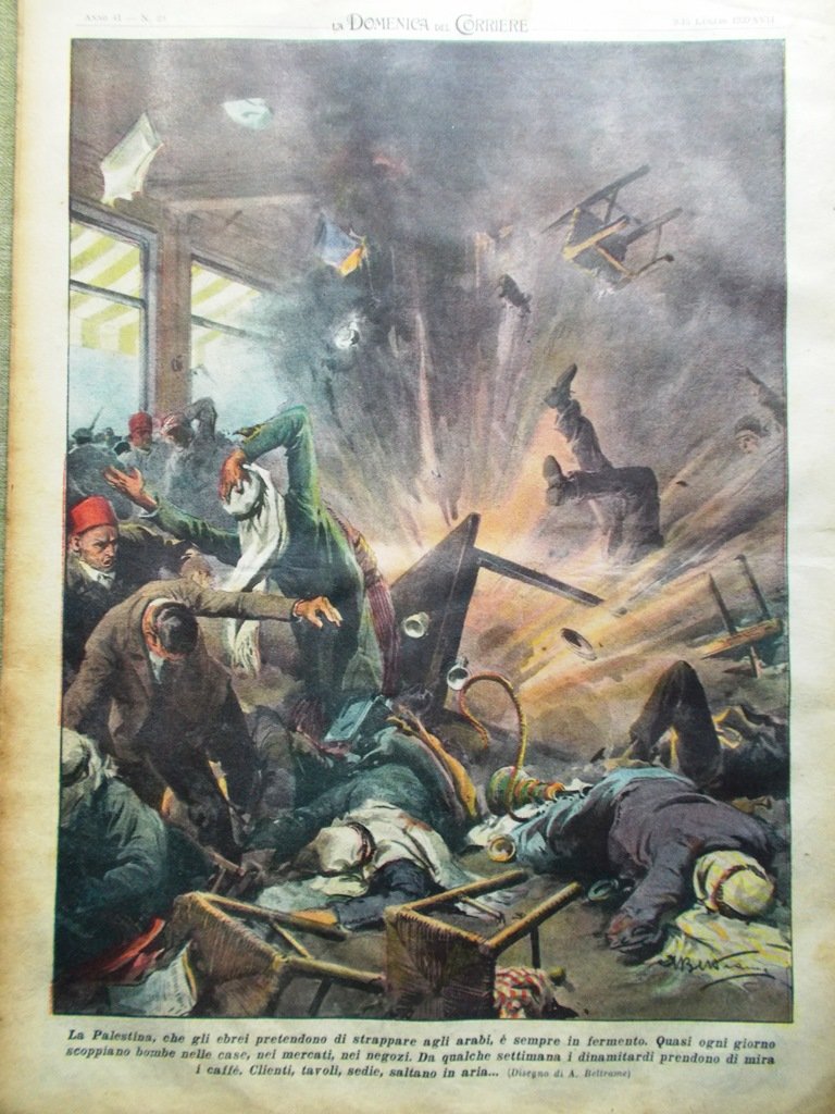 La Palestina, che gli ebrei pretendono di strappare agli arabi, è sempre in fermento. Quasi ogni giorno scoppiano bombe nelle case, nei mercati, nei negozi. Da qualche settimana i dinamitardi prendono di mira i caffè (Achille Beltrame)