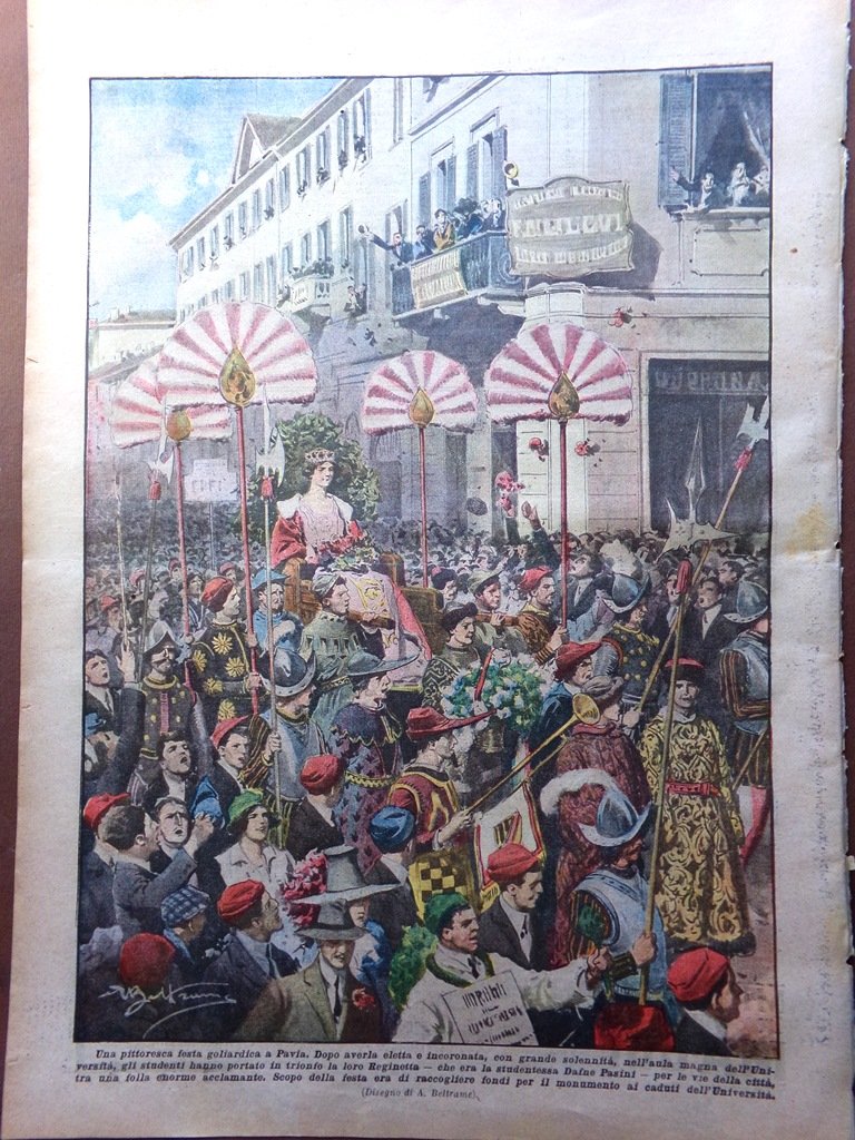 Una pittoresca festa goliardica a Pavia. Dopo averla eletta e incoronata, con grande solennità, nell'aula magna dell'Università, gli studenti hanno portato in trionfo la loro Reginetta, la studentessa Dafne Pasini, per le vie della città. Scopo della festa era di raccogliere fondi per il monumenti ai caduti dell'Università (Achille Beltrame)