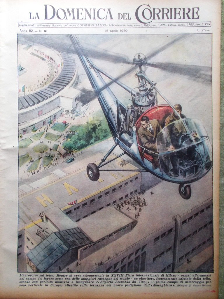 L'aeroporto sul tetto. Mentre si apre solennemente la XXVIII Fiera internazionale di Milano, un elicottero festosamente salutato dalla folla scende con perfetta manovra a inaugurare l'eliporto "Leonardo da Vinci", il primo campo di atterraggio per volo verticale in Europa (De Gaspari)