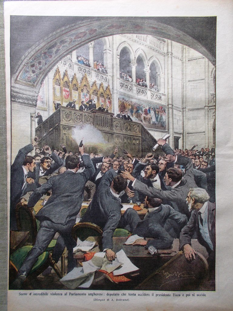 Scene d'incredibile violenza al parlamento ungherese: deputato che tenta di uccidere il presidente Tisza e poi si uccide (Achille Beltrame)
