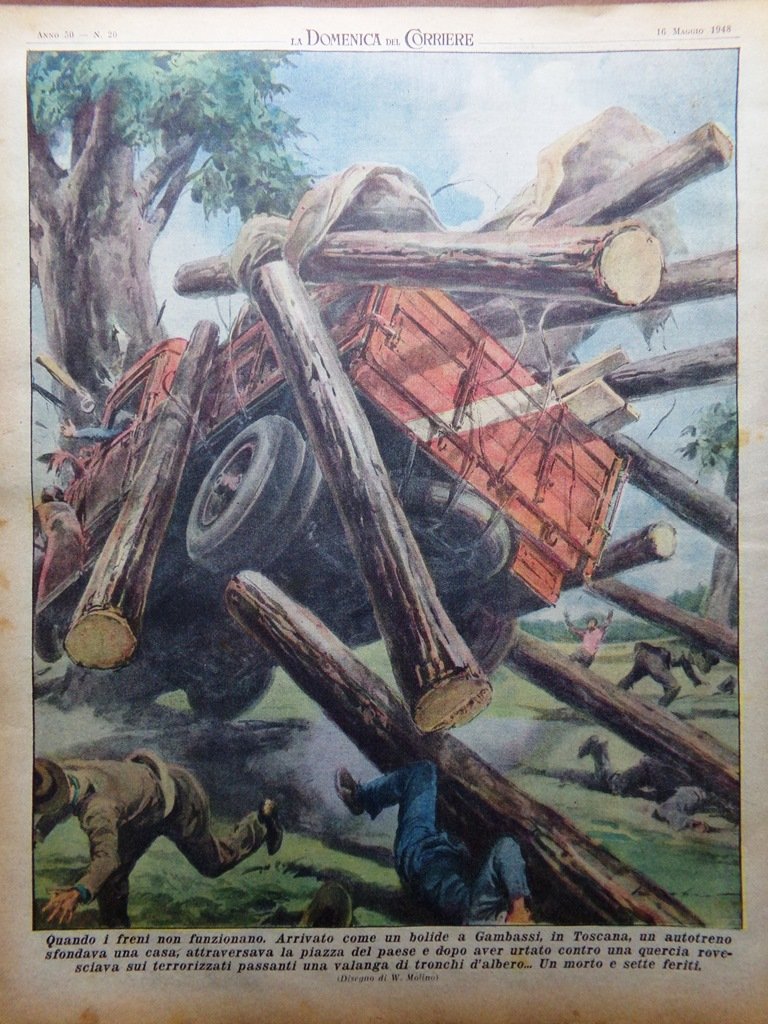 Arrivato come un bolide a Gambassi, in Toscana, un autotreno sfondava una casa, attraversava la piazza del paese e dopo aver urtato contro una quercia rovesciava sui terrorizzati passanti una valanga di tronchi d'albero (Walter Molino)
