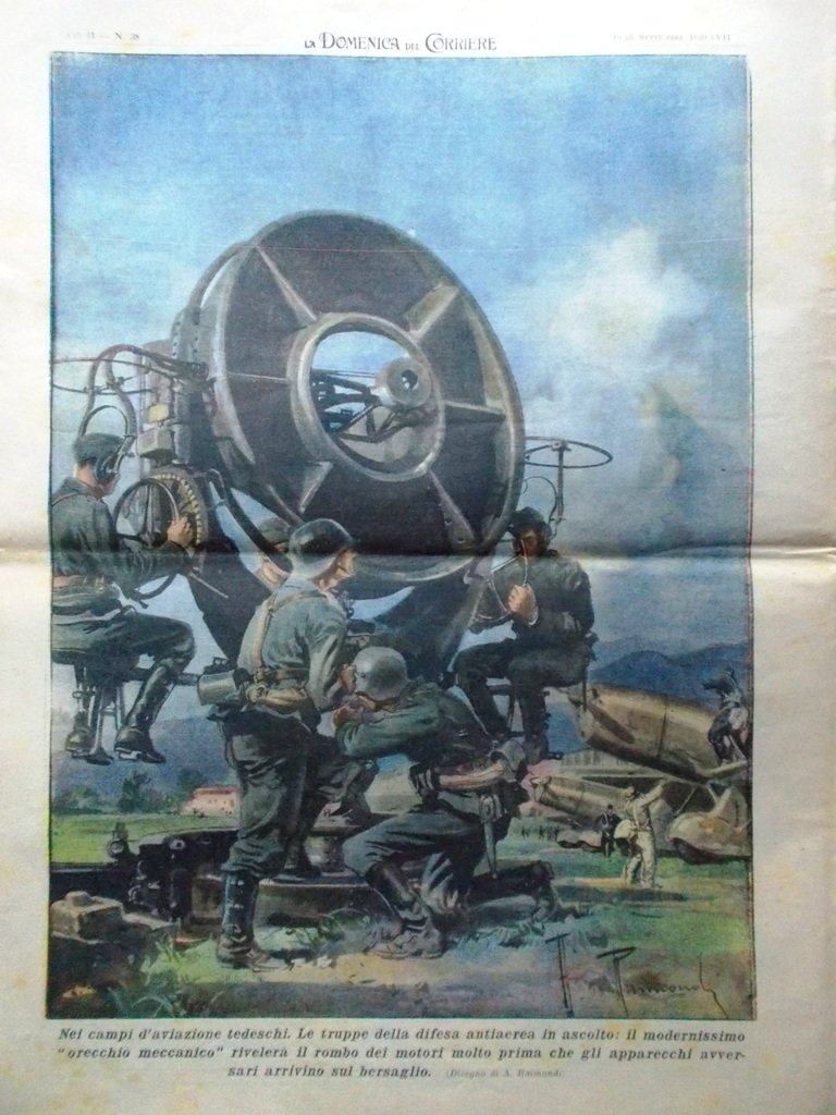 Nei campi di aviazione tedeschi. Le truppe della difesa antiaerea in ascolto: il modernissimo "orecchio meccanico" rivelerà il rombo dei motori molto prima che gli apparecchi avversari arrivino sul bersaglio (Achille Beltrame)