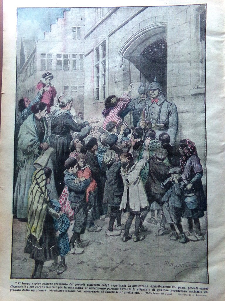 LA DOMENICA DEL CORRIERE Rivista Originale del 17 Dicembre 1916 Anno 18 nr. 51 pagine: 16 dimensioni: 38 x 28 cm IN PRIMA PAGINA: "I nostri velivoli bombardarono il campo di aviazione nemico in Prosecco con effetti giudicati assai efficaci" (Achille Beltrame) NELL'ULTIMA PAGINA: "Il lungo corteo sempre crescente dei piccoli fanciulli belgi aspettanti la quotidiana distribuzione del pane." (Achille Beltrame) ALL'INTERNO: I documenti della Kultur America: gli appartamenti a trasformazione Decorati al valore Le nuove forze di un paese neutro: gli Stati Uniti La morte del poeta belga Emile Verhaeren Polizia segreta e spionaggio tedesco Sulle pendici del Veliki Hribak Con i serbi in Macedonia CONDIZIONI DELLA RIVISTA: BUONE, NORMALI SEGNI DEL TEMPO, SOVRACOPERTINE MANCANTI NOTE PARTICOLARI: PICCOLO STRAPPO IN BASSO A PAG 11/12 (NESSUN PEZZO MANCANTE) E AL CENTRO DI PAG 13/14 (NESSUN PEZZO MANCANTE), PICCOLI STRAPPETTI NEI BORDI ESTERNI DI ALCUNE PAGINE