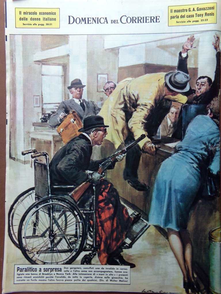 Due gangsters, camuffati uno da invalido in carrozzella e l'altro come suo accompagnatore, hanno svaligiato una banca di Brooklyn, a New York. Alla intimidazione di "mani in alto" i presenti sono rimasti annichiliti perché l'invalido, da sotto la coperta, ha estratto un fucile mentre l'altro faceva piazza pulita dei quattrini (Walter Molino)