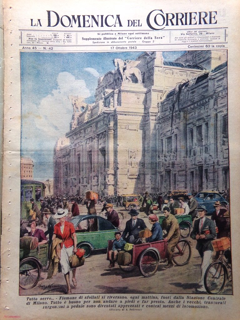 Tutto serve.Fiumane di sfollati si riversano ogni mattina, fuori dalla Stazione Centrale di Milano. Tutto è buono per non andare a piedi e far presto. Anche i vecchi, trascurati furgoncini a pedale sono diventati apprezzati e contesi mezzi di locomozione (Achille Beltrame)