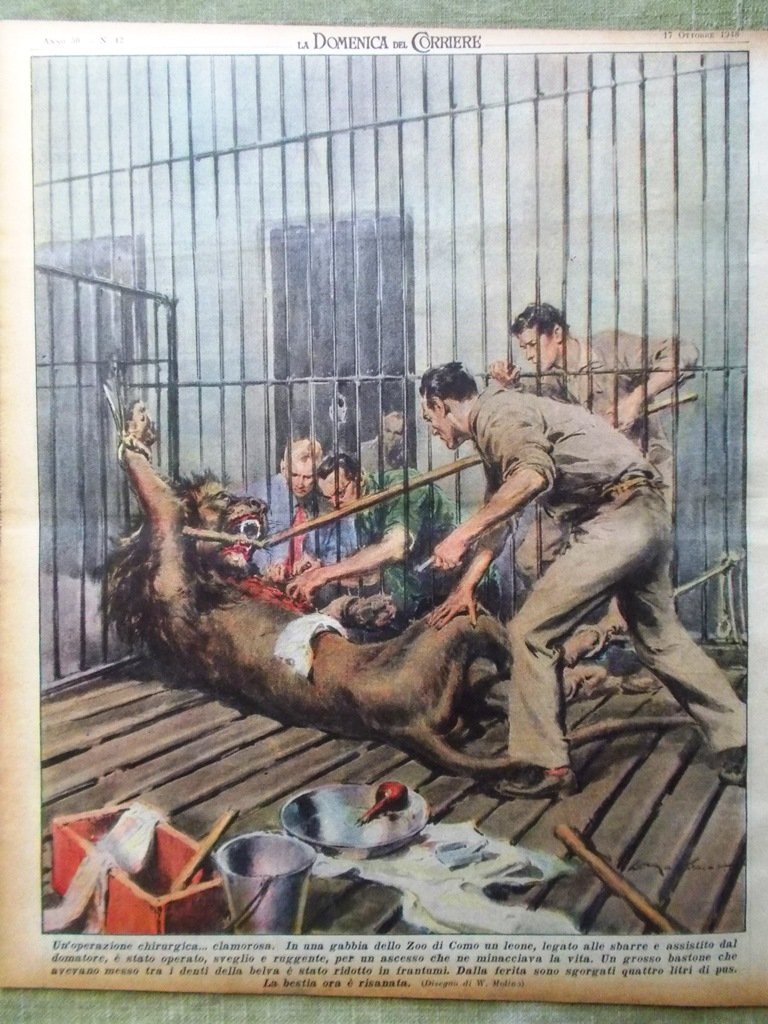 In una gabbia dello Zoo di Como, un leone legato alle sbarre e assistito dal domatore, è stato operato, sveglio e ruggente per un ascesso che ne minacciava la vita. Un grosso bastone che avevano messo tra i denti della belva è stato ridotto in frantumi. La bestia ora è risanata (Walter Molino)