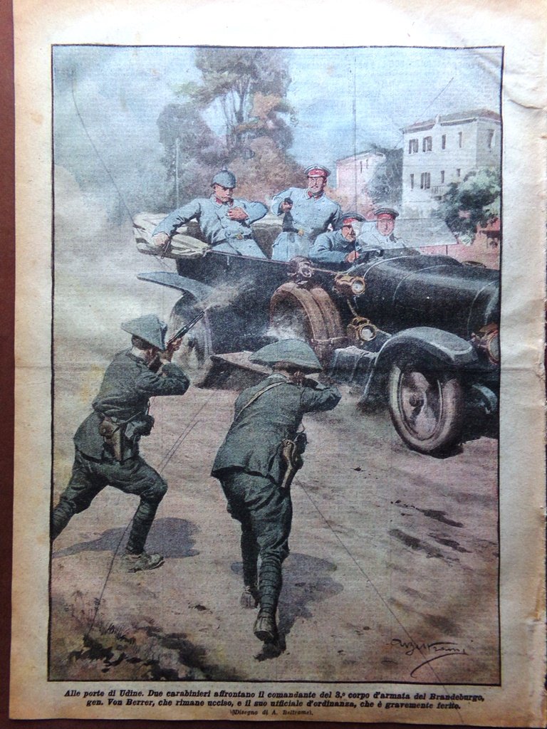 Alle porte di Udine. Due carabinieri affrontano il comandante del 3 corpo d'armata del BHrandeburgo gen. Von Berrer, che rimane ucciso, e il suo ufficiale d'ordinanza che gravemente ferito (Achille Beltrame)