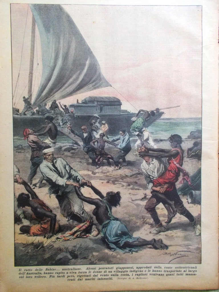Il ratto delle Sabine. australiane. Alcuni pescatori giapponesi, approdati sulle coste settentrionali dell'Australia hanno rapito a viva forza le donne di un villaggio indigeno e le hanno trasportate al largo sul loro veliero. Più tardi però, rigettati dal vento sulla costa, i rapitori venivano quasi tutti massacrati dai mariti inferociti (Achille Beltrame)