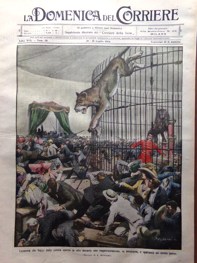Leonessa che fugge dalla gabbia aperta in alto durante una rappresentazione, in Borgogna, e spaventa un intero paese (Achille Beltrame)