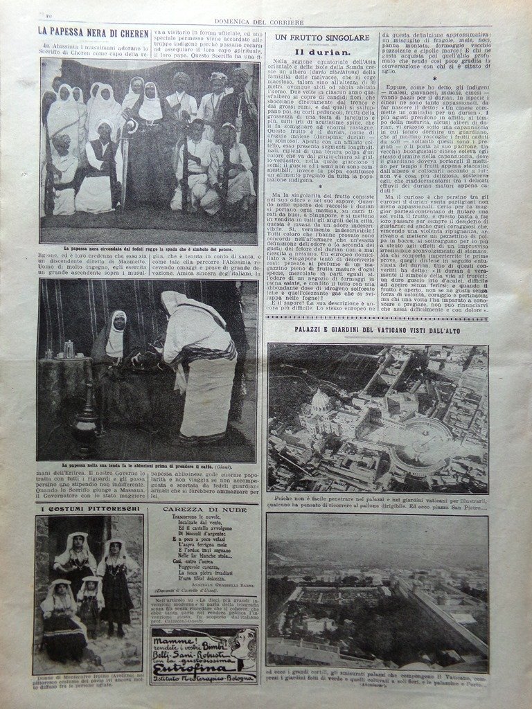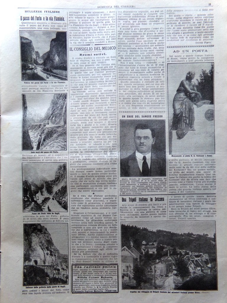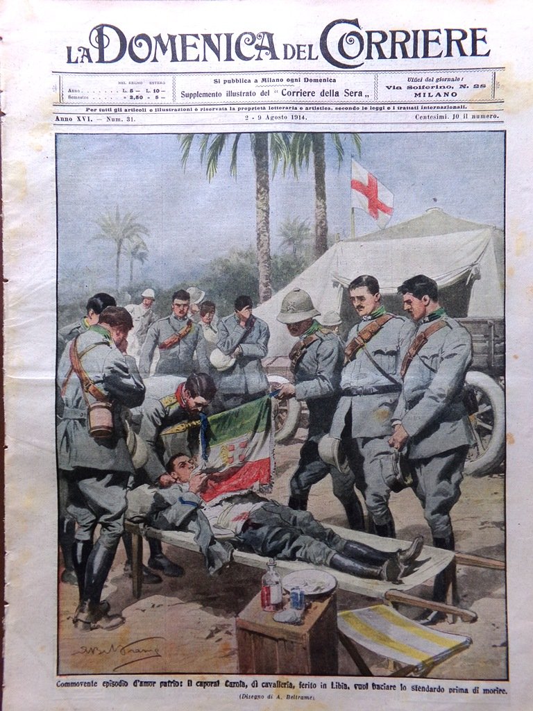 LA DOMENICA DEL CORRIERE Rivista Originale del 2 Agosto 1914 Anno 16 nr. 31 pagine: 16 dimensioni: 38 x 28 cm IN PRIMA PAGINA: Commovente episodio d'amor patrio: il caporal Carola, di cavalleria, ferito in Libia, vuol baciare lo stendardo prima di morire (Achille Beltrame) NELL'ULTIMA PAGINA: Le cause celebri: il drammatico e teatrale processo di Parigi contro la sig. Caillaux che uccise il direttore del "Figaro" (Achille Beltrame) ALL'INTERNO: Commemorazione di Garibaldi impedita da italiani con la violenza a New York Trasformazione della stazione di Napoli Austria-Ungheria e Serbia in armi Un museo del genio militare nelle casermette di Urbano VIII a Sant'Angelo La papessa nera di Cheren Il passo del Furlo e la via Flaminia Palazzi e giardini del Vaticano visti dall'alto CONDIZIONI DELLA RIVISTA: BUONE, NORMALI SEGNI DEL TEMPO, SOVRACOPERTINE MANCANTI NOTE PARTICOLARI: NESSUNA