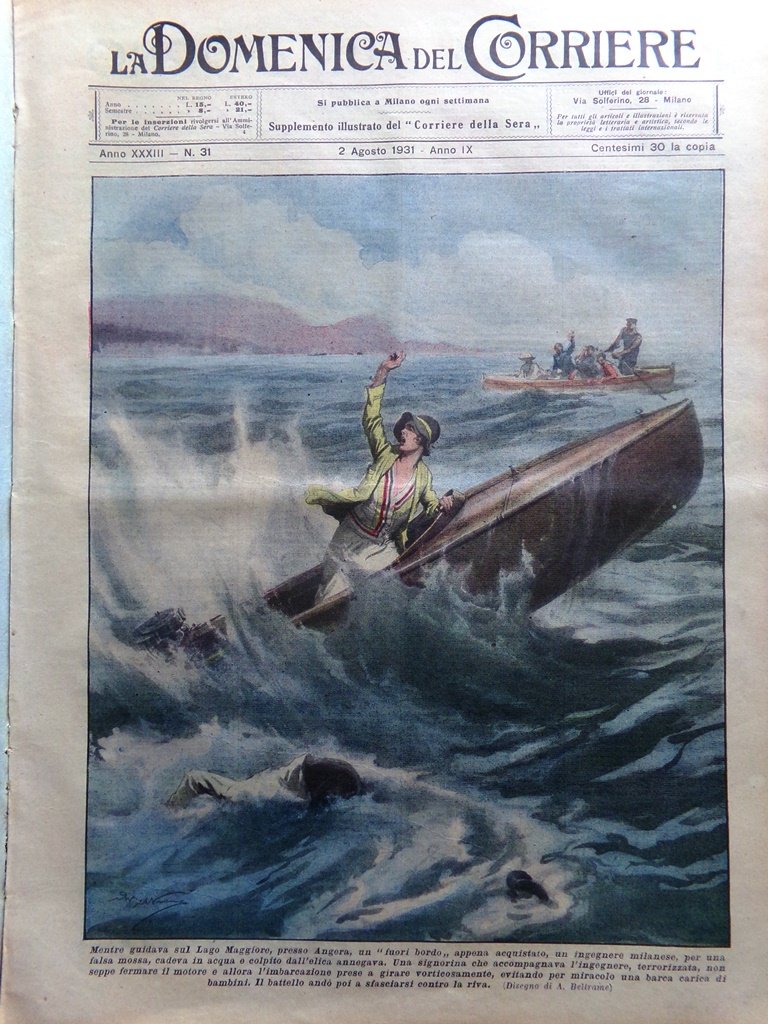 Mentre guidava sul Lago Maggiore, presso Angera, un "fuori bordo", appena acquistato, un ingegnere milanese, per una falsa mossa, cadeva in acqua e colpito dall'elica annegava. Una signorina che lo accompagnava, terrorizzata non seppe fermare il motore e allora l'imbarcazione prese a girare vorticosamente, evitando per miracolo una barca carica di bambini. Il battello poi andò a sfasciarsi contro la riva (Achille Beltrame)