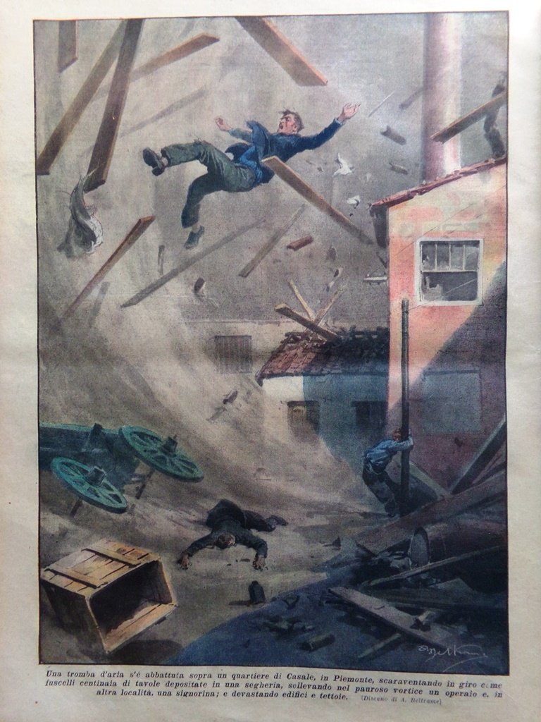 Una tromba d'aria si è abbattuta sopra un quartiere di Casale, in Piemonte, scaraventando in giro come fuscelli centinaia di tavole depositate in una segheria, sollevando nel pauroso vortice un operaio e una signorina e devastando edifici e tettoie (Achille Beltrame)