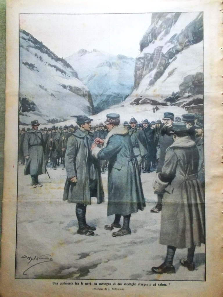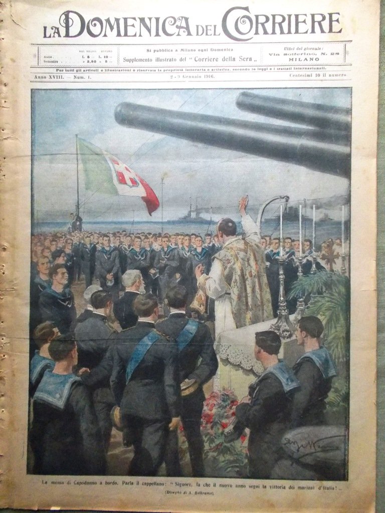 LA DOMENICA DEL CORRIERE Rivista del 2 Gennaio 1916 Anno 18 nr. 1 pagine: 16 dimensioni: 38 x 28 cm IN PRIMA PAGINA: La messa di Capodanno a bordo. Parla il cappellano: "Signore, fa che il nuovo anno segni la vittoria dei marinai d'Italia!" (Achille Beltrame) NELL'ULTIMA PAGINA: Una cerimonia fra le nevi: la consegna di due medaglie d'argento al valore (Achille Beltrame) ALL'INTERNO: Come viaggiano i nostri feriti Caddero sul campo della gloria Tipi femminili dei paesi redenti Un attacco tedesco coi gas asfissianti Sull'Isonzo Morto il maggior generale Gabriele Berardi, sul Carso Dopo l'abbandono delle posizioni di Suvla-Anzac CONDIZIONI DELLA RIVISTA: BUONE, NORMALI SEGNI DEL TEMPO. SOVRACOPERTINE ASSENTI NOTE PARTICOLARI: MACCHIE DEL TEMPO - STRAPPO IN BASSO CON PEZZO MANCANTE A PAG 7/8 (V. III FOTO)