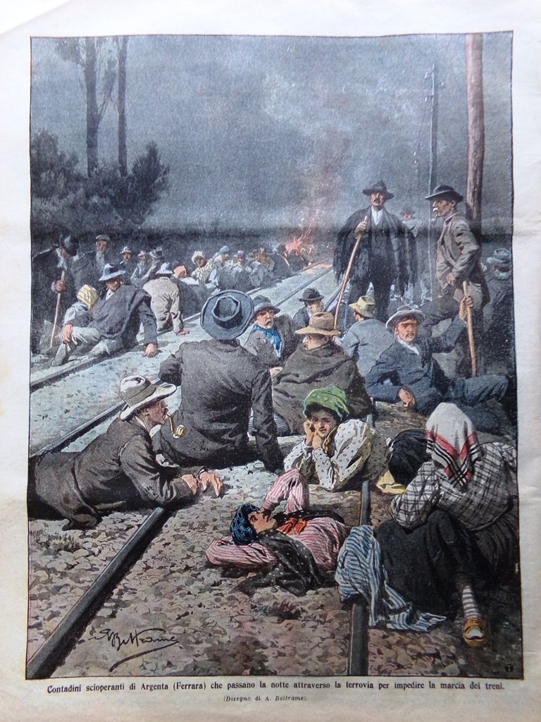 Contadini scioperanti di Argenta (Ferrara) che passano la notte attraverso la ferrovia per impedire la marcia dei treni (Achille Beltrame)