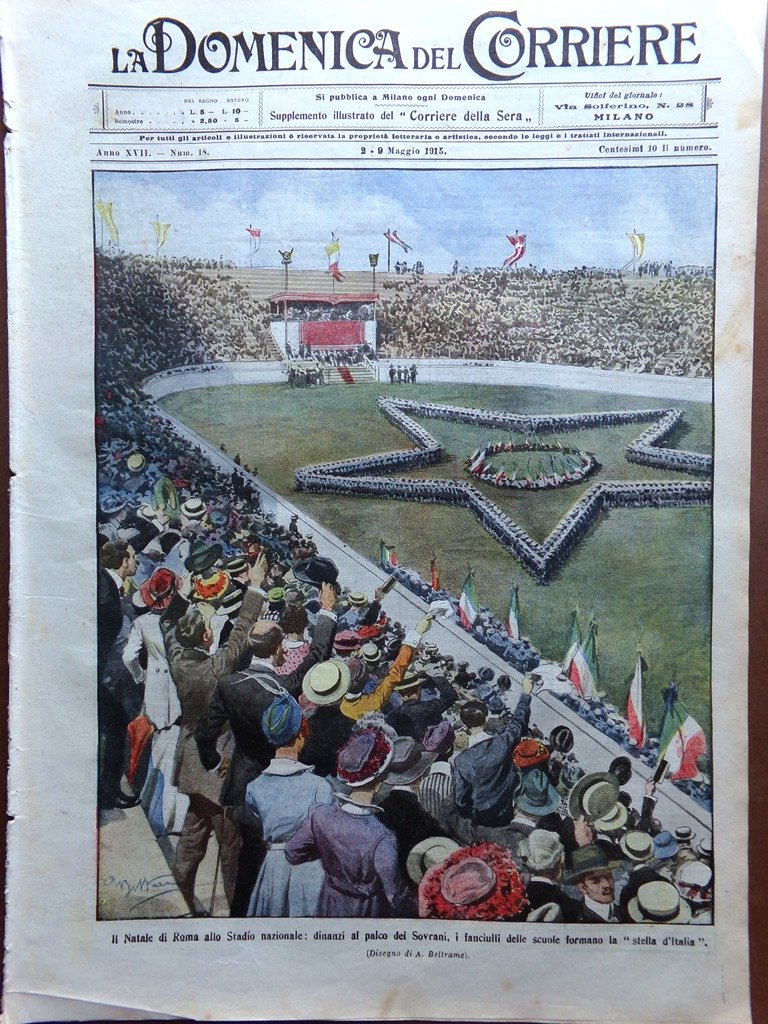 LA DOMENICA DEL CORRIERE Rivista Originale del 2 Maggio 1915 Anno 17 nr. 18 pagine: 16 dimensioni: 39 x 28 cm IN PRIMA PAGINA: Il Natale di Roma allo Stadio nazionale: dinanzi al palco dei Sovrani, i fanciulli delle scuole formano la "stella d'Italia"(Achille Beltrame) NELL'ULTIMA PAGINA: Nei Dardanelli, sotto il fuoco dei turchi: audacissima impresa di due battelli inglesi inviati a distruggere un sommergibile arenato (Achille Beltrame) ALL'INTERNO: I russi a Przemysl Dopo nove mesi di guerra: Guglielmo II, Kronprinz e il principe Oscar La celebrazione del Natale di Roma La guerra nelle colonie La festa allo stadio I preparativi contro i Dardanelli I giovanissimi dell'esercito austriaco Chiesetta dedicata alla "Madonna del lago" sul laghetto di Scanno CONDIZIONI DELLA RIVISTA: DISCRETE, NORMALI SEGNI DEL TEMPO NOTE PARTICOLARI: PICCOLISSIMI STRAPPETTI NEI BORDI DI ALCUNE PAGINE, PICCOLO STRAPPO IN BASSO A PAG 13/14