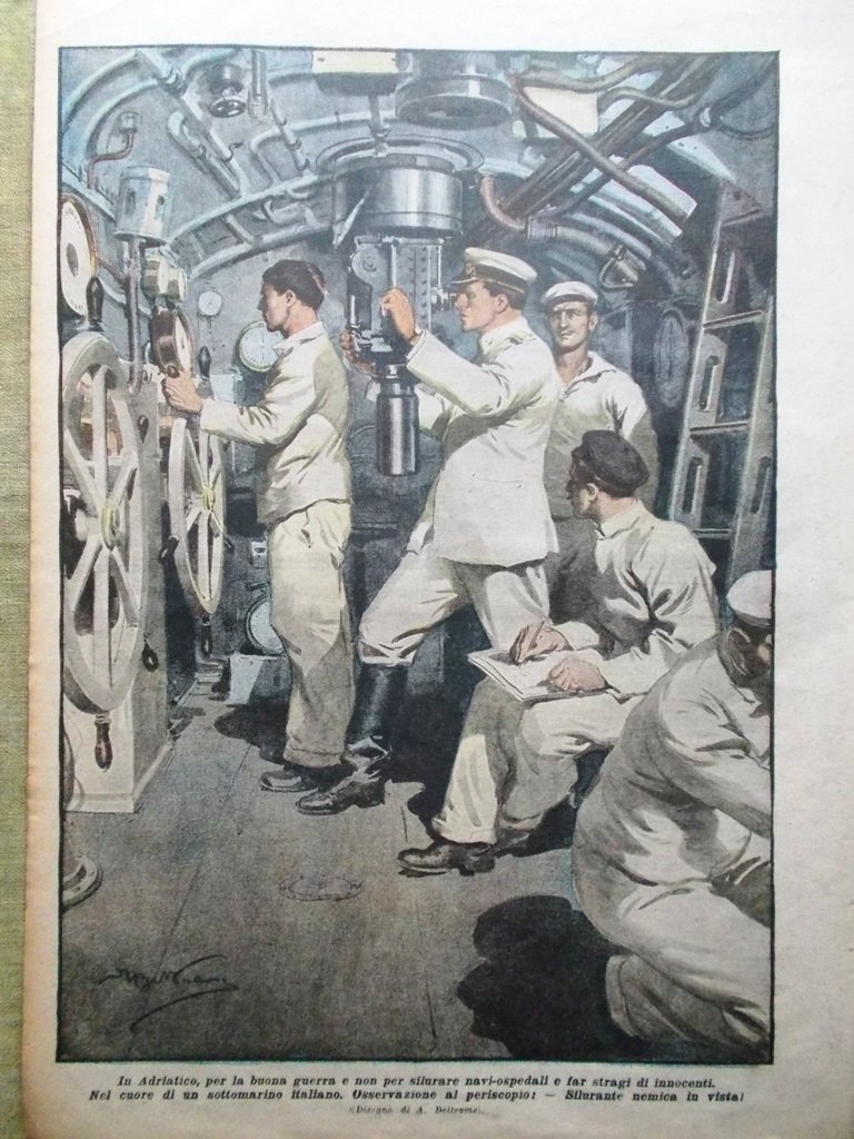 In Adriatico, per la buona guerra e non per silurare navi-ospedali e far strage di innocenti. Nel cuore di un sottomarino italiano. Osservazione al periscopio: - Silurante nemica in vista ! (Achille Beltrame)