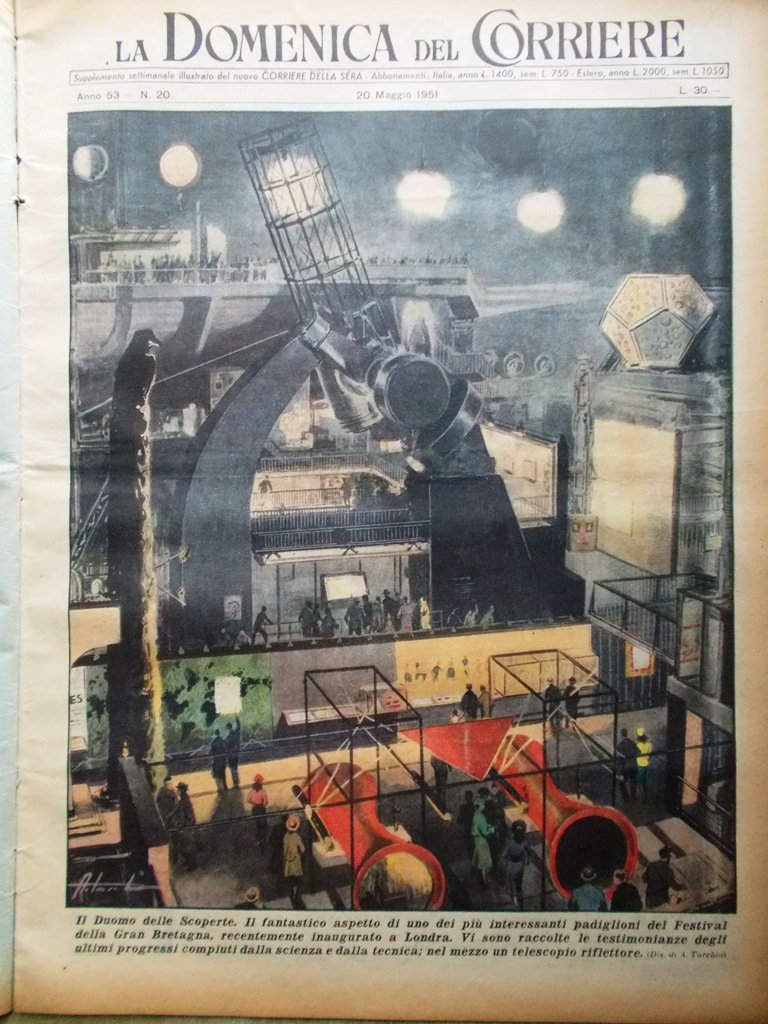 Il Duomo delle Scoperte. Il fantastico aspetto di uno dei più interessanti padiglioni del Festival della Gran Bretagna, recentemente inaugurato a Londra. Vi sono raccolte le testimonianze degli ultimi progressi compiuti dalla scienza e dalla tecnica; nel mezzo un telescopio riflettore (Aldo Torchio)