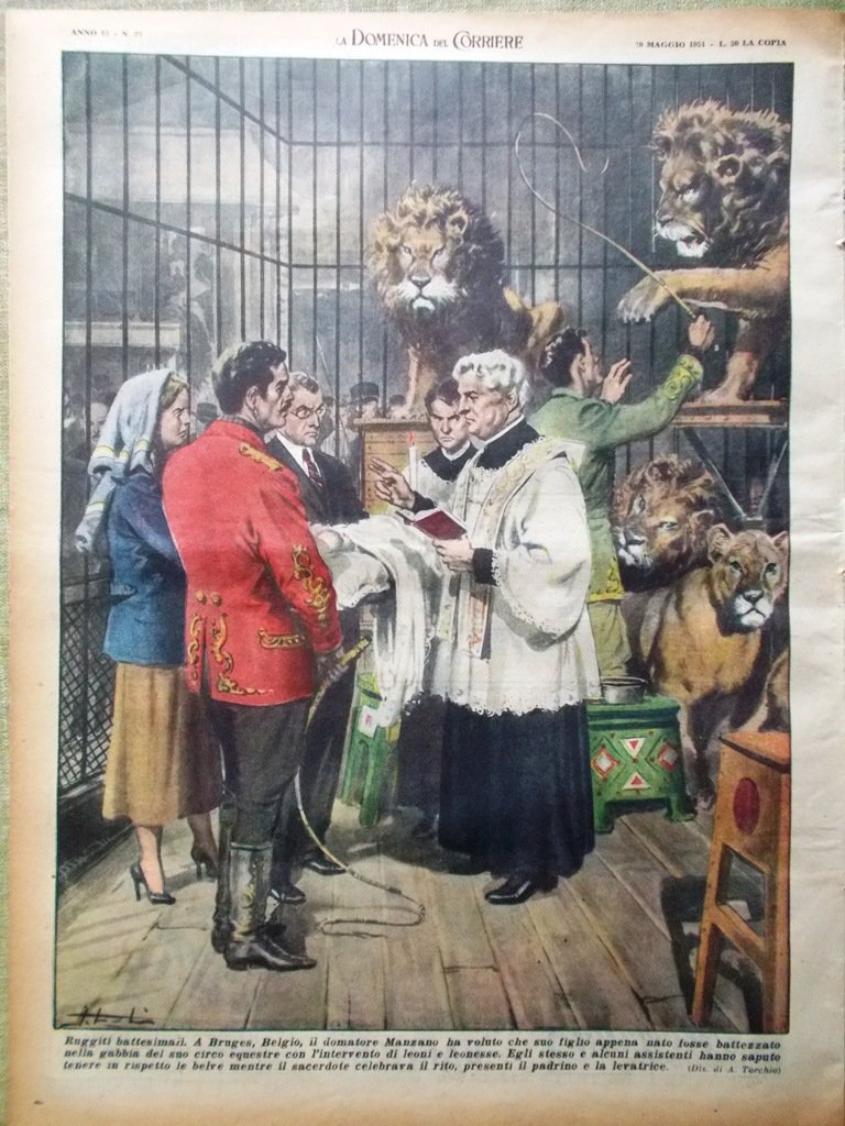 A Bruges, Belgio, il domatore Manzano ha voluto che suo figlio appena nato fosse battezzato nella gabbia del suo circo equestre con l'intervento di leoni e leonesse. Egli stesso e alcuni assistenti hanno saputo tenere in rispetto le belve mentre il sacerdote celebrava il rito, presenti il padrino e la levatrice (Aldo Torchio)