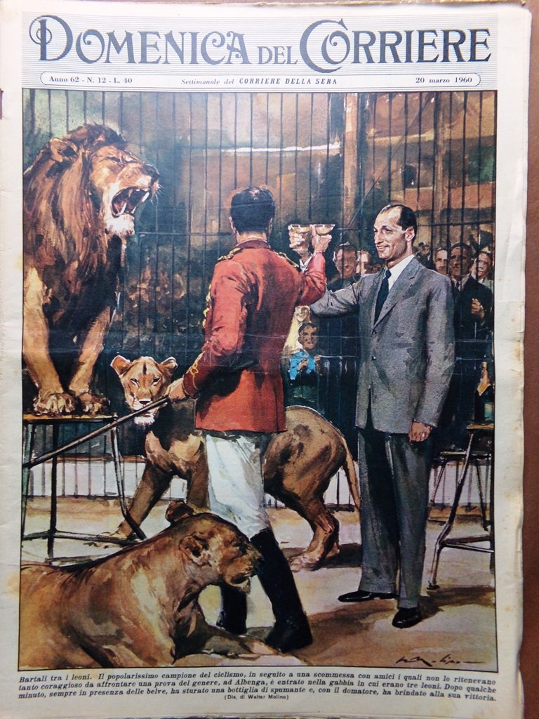 Il popolarissimo campione del ciclismo Gino Bartali, in seguito a una scommessa con amici, ad Albenga, entrato nella gabbia in cui erano tre leoni. Dopo qualche minuto, sempre in presenza delle belve, ha sturato una bottiglia di spumante e, con il domatore, ha brindato alla sua vittoria (Walter Molino)