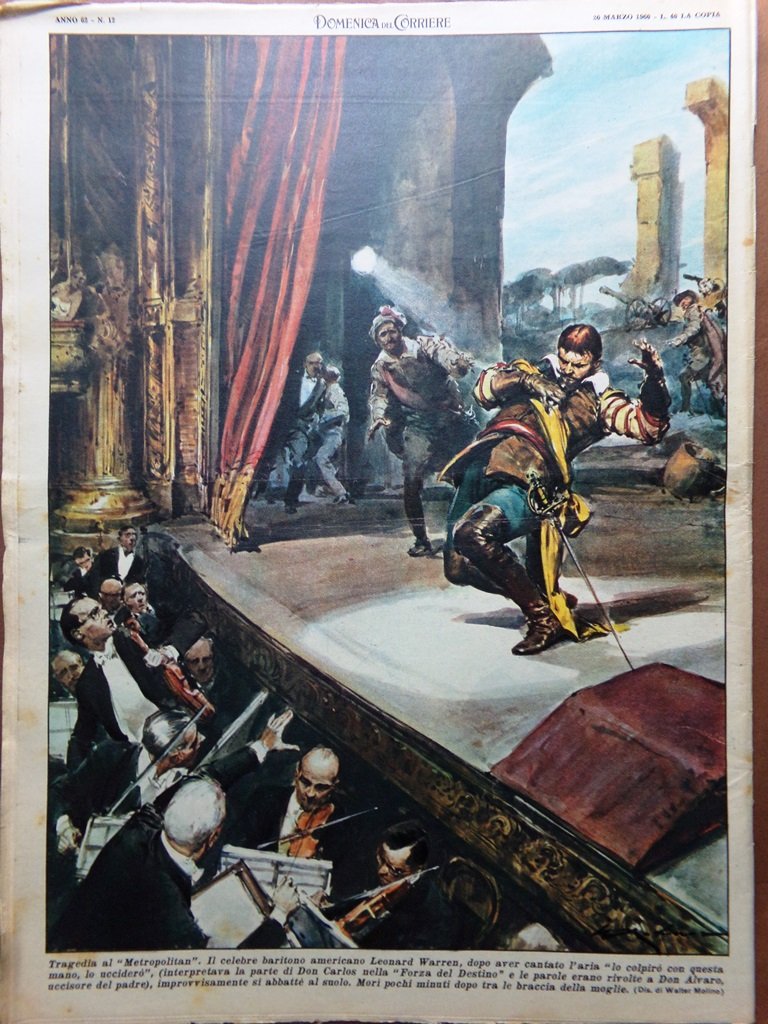 Tragedia al "Metropolitan". Il celebre baritono americano Leonard Warren, dopo aver cantato l'aria "lo colpirò con questa mano, lo ucciderò" (interpretava Don Carlos nella "Forza del Destino"), improvvisamente si abbattè al suolo. Morì pochi minuti dopo tra le braccia della moglie (Walter Molino)