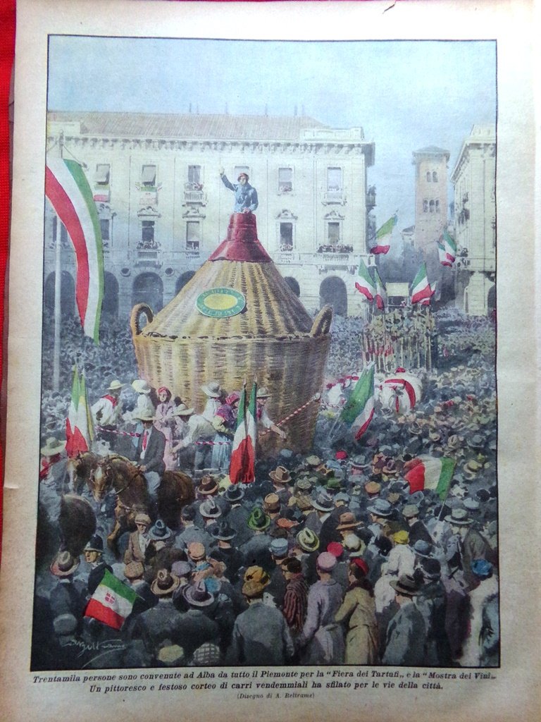Trentamila persone sono convenute ad Alba da tutto il Piemonte per la "Fiera dei Tartufi" e la "Mostra dei Vini". Un pittoresco e festoso corteo di carri vendemmiali ha sfilato per le vie della città (Achille Beltrame)