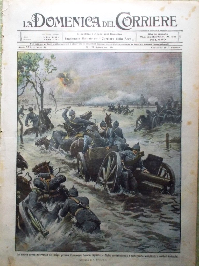 La nuova arma guerresca dei belgi: presso Termonde furono tagliate le dighe sorprendendo e annegando artiglierie e soldati tedeschi (Achille Beltrame)