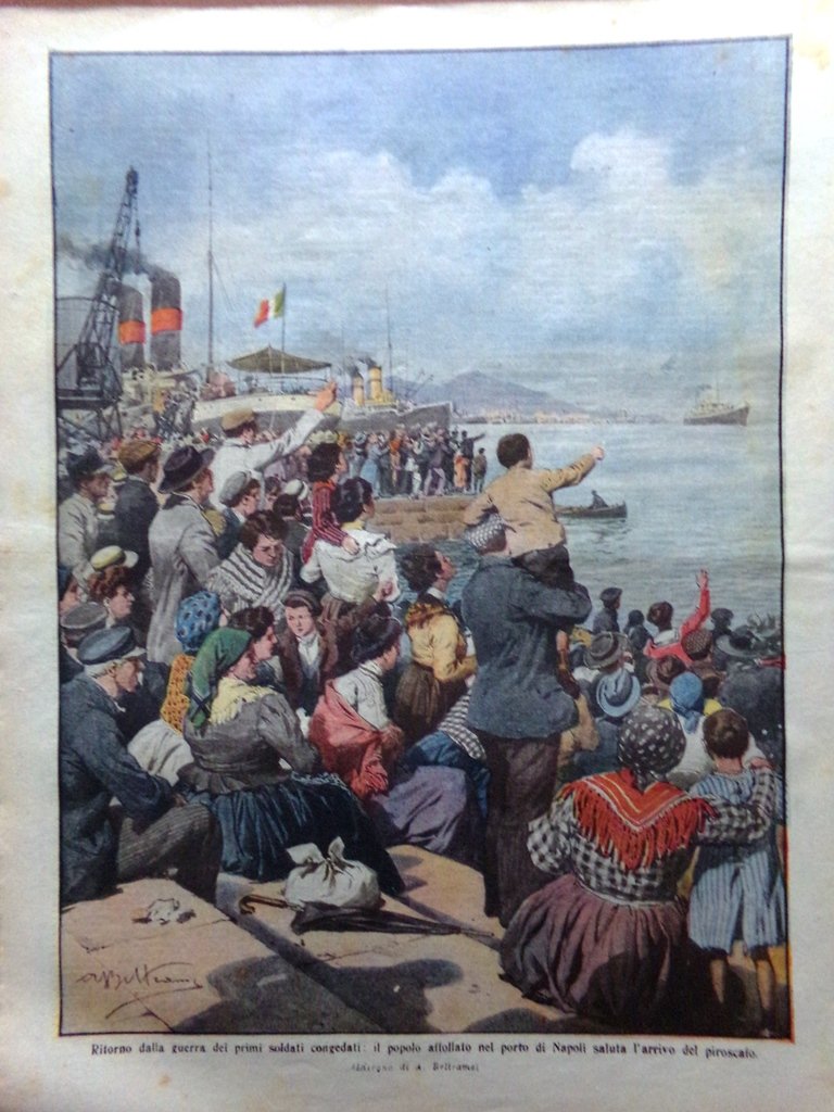 Ritorno dalla guerra dei primi soldati congedati: il popolo affolato nel porto di Napoli saluta d'arrivo del piroscafo (Achille Beltrame)