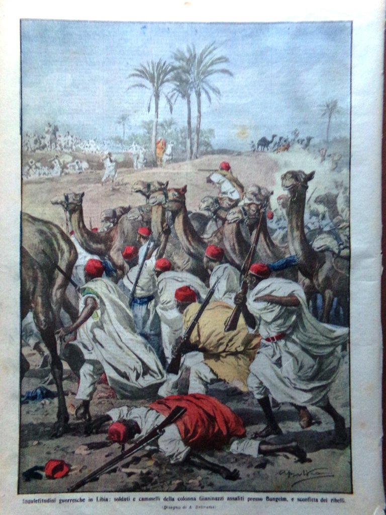 LA DOMENICA DEL CORRIERE Rivista Originale del 21 Febbraio 1915 Anno 17 nr. 8 pagine: 16 dimensioni: 39 x 29 cm IN PRIMA PAGINA: Abbondanti disastrose nevicate in Italia: valanga che presso Tenda travolge un baraccamento e uccide impiegati e operai (Achille Beltrame) NELL'ULTIMA PAGINA: Inquietitudini guerresche in Libia: soldati e cammelli della colonna Gianinazzi assaliti presso Bungeim e sconfitta dei ribelli (Achille Beltrame) ALL'INTERNO: Ministri delle finanze a convegno: Bark, Ribot, George La morte di Oreste Calabresi La prima messa ad Ortucchio, presso Avezzano, fra le rovine del terremoto Inaugurato il servizio tranviario a Cagliari Sezione della Croce Rossa giapponese La Halle aux draps di Ypres dopo l'ultimo bombardamento Palazzi e padiglioni a San Francisco di California Un ponte di 400 metri sul Tagliamento Anniversari storici: la cacciata del cardinale Alberoni da San Marino Le defezioni fra gli ascari libici CONDIZIONI DELLA RIVISTA: BUONE, NORMALI SEGNI DEL TEMPO, SOVRACOPERTINE MANCANTI NOTE PARTICOLARI: STRAPPO CON PEZZETTO MANCANTE SULLA COPERTINA PRINCIPALE (V. FOTO)
