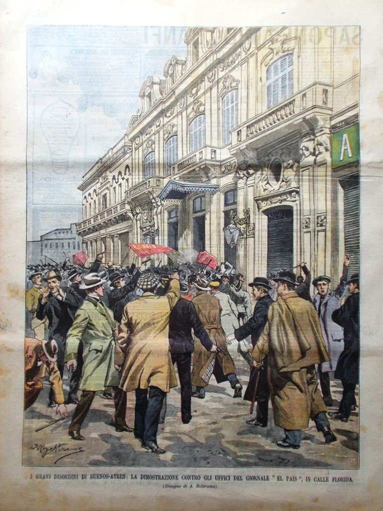 I gravi disordini di Buenos Aires: la dimostrazione contro gli uffici del giornale "El Pais" in Calle Florida (Achille Beltrame)