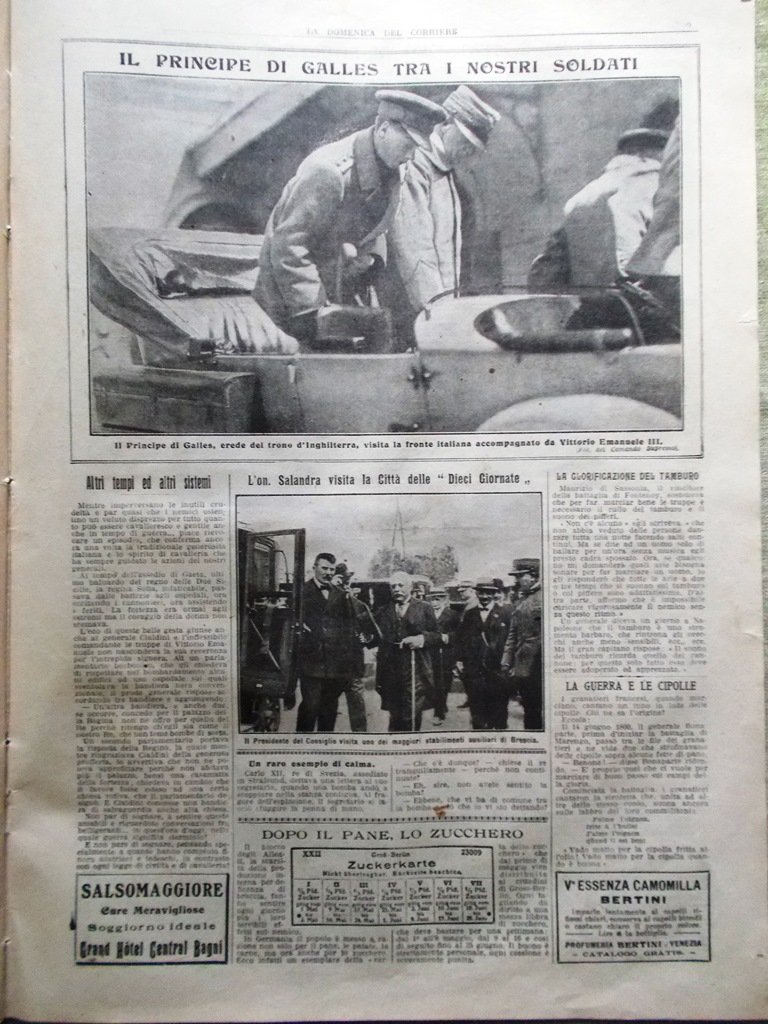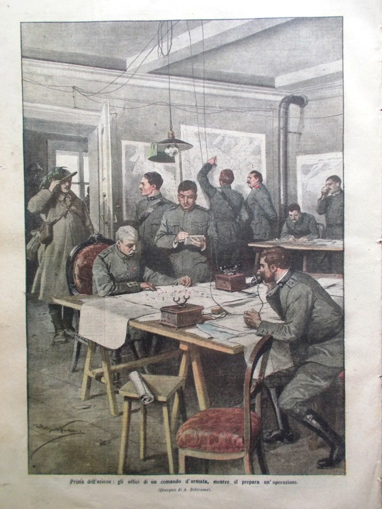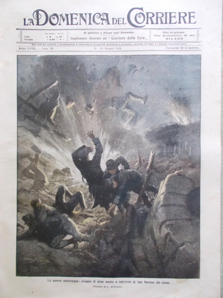 LA DOMENICA DEL CORRIERE Rivista Originale del 21 Maggio 1916 Anno 18 nr. 21 pagine: 16 dimensioni: 39 x 28 cm IN PRIMA PAGINA: La guerra sotterranea: scoppio di mine nostre a sud-ovest di San Marino del Carso (Achille Beltrame) NELL'ULTIMA PAGINA: Prima dell'azione: gli uffici di un comando d'armata, mentre si prepara un'operazione (Achille Beltrame) ALL'INTERNO: Francobolli di guerra La regina d'Inghilterra con la principessa Mary e il principe Alberto Decorati al valore Il principe di Galles tra i nostri soldati Sul Carso L'on. Salandra in visita a Brescia Dopo il tentativo di rivolta in Irlanda Nel Vosgi La nostra guerra illustrata CONDIZIONI DELLA RIVISTA: MOLTO BUONE, NORMALI SEGNI DEL TEMPO, SOVRACOPERTINE ASSENTI NOTE PARTICOLARI: MACCHIE DEL TEMPO IN ALTO DELLE PAGINE FINALI