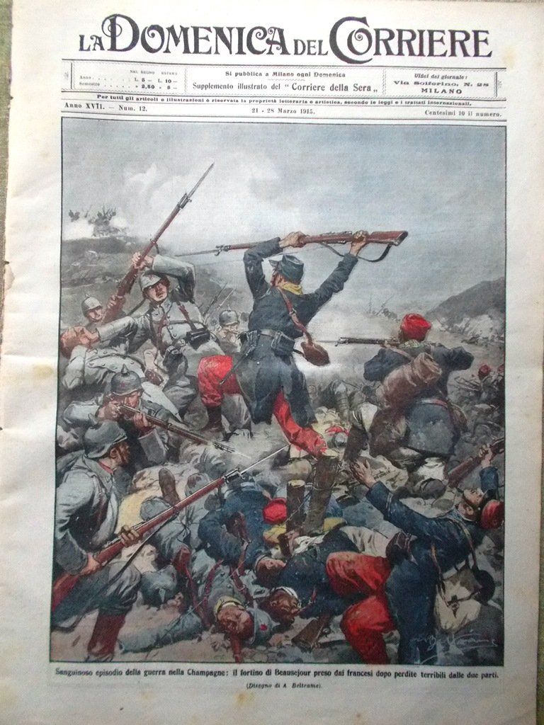LA DOMENICA DEL CORRIERE Rivista Originale del 21 Marzo 1915 Anno 17 nr. 12 pagine: 16 dimensioni: 38,5 x 28,5 cm IN PRIMA PAGINA: Sanguinoso episodio della guerra nella Champagne: il fortino di Beausejour preso dai francesi dopo perdite terribili dalle due parti(Achille Beltrame) NELL'ULTIMA PAGINA: L'azione assidua delle squadre per forzare i Dardanelli ha generato il panico a Costantinopoli di dove chi può fugge in Asia (Achille Beltrame) ALL'INTERNO: Figure del giorno: l'arciduchessa Maria Giuseppe d'Austria, Viera nuovo presidente dell'Uruguay I terremoti italiani: l'apparente conferma di una paurosa profezia La birra di Berlino Monumento a Florence Nightingale a Londra La scienza medica ed i broglio elettorale Apertura del passaggio dello Spluga attraverso la neve La Tripolitania feconda Il nuovo palazzo per le casse postali di risparmio a Roma Il pittore Gaetano Previati CONDIZIONI DELLA RIVISTA: BUONE, NORMALI SEGNI DEL TEMPO. SOVRACOPERTINE ASSENTI NOTE PARTICOLARI: NESSUNA