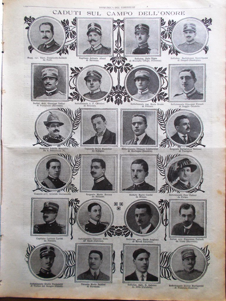 LA DOMENICA DEL CORRIERE Rivista Originale del 22 Agosto 1915 Anno 17 nr. 34 pagine: 16 dimensioni: 38 x 28 cm IN PRIMA PAGINA: Guerra modernissima: i nostri lanciano granate a mano nelle trincee nemiche distanti pochi metri (Achille Beltrame) NELL'ULTIMA PAGINA: Il volo di d'Annunzio su Trieste. Il poeta lancia patriottici messaggi ai nostri fratelli: "La fine del vostro martirio è prossima!" (Achille Beltrame) ALL'INTERNO: Caduti sul campo dell'onore (fotografie) L'ambulanza fluviale della Croce Rossa Contro il barbaro che assale dall'alto Scene e scenette lungo il fronte I capi supremi della nostra guerra: Porro, Cadorna, il Re Principi al campo: il duca d'Aosta con il figlio Amedeo Bersaglieri e artiglieri La lana CONDIZIONI DELLA RIVISTA: BUONE, NORMALI SEGNI DEL TEMPO, SOVRACOPERTINE MANCANTI NOTE PARTICOLARI: LEGGERE MACCHIE DEL TEMPO IN ALCUNE PAGINE