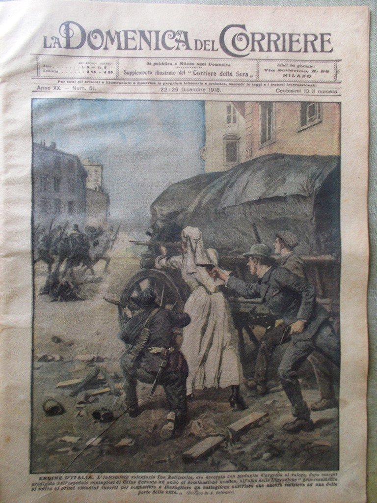 L'infermiera volontaria Ina Battistella, ora decorata con medaglia d'argento al valore, dopo essersi prodigata nell'ospedale contagiosi di Udine durante un anno di dominazione nemica, all'alba della liberazione si univa ai primi cittadini insorti per combattere e sbaragliare un battaglione austriaco che resisteva nella città (Achille Beltrame)