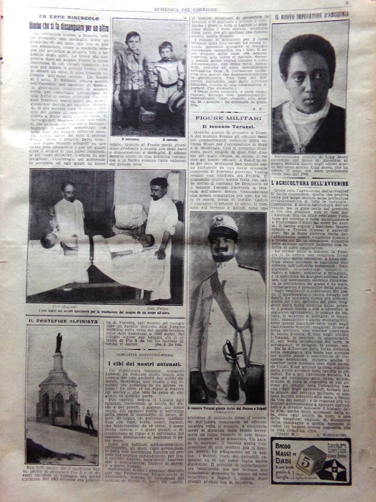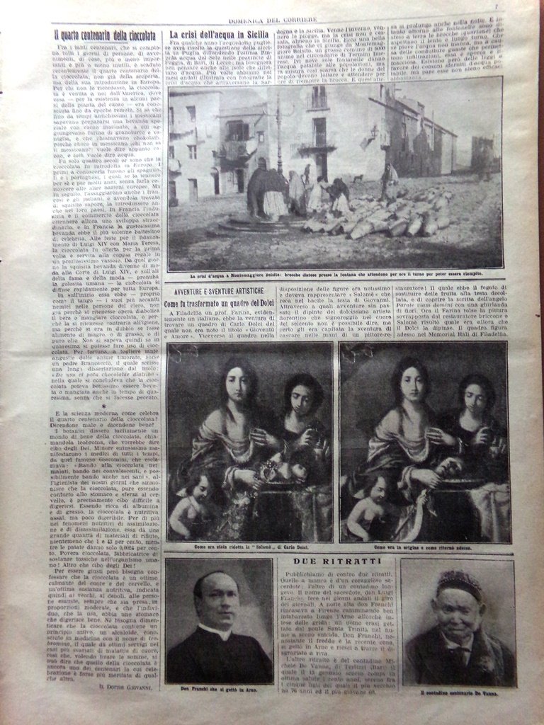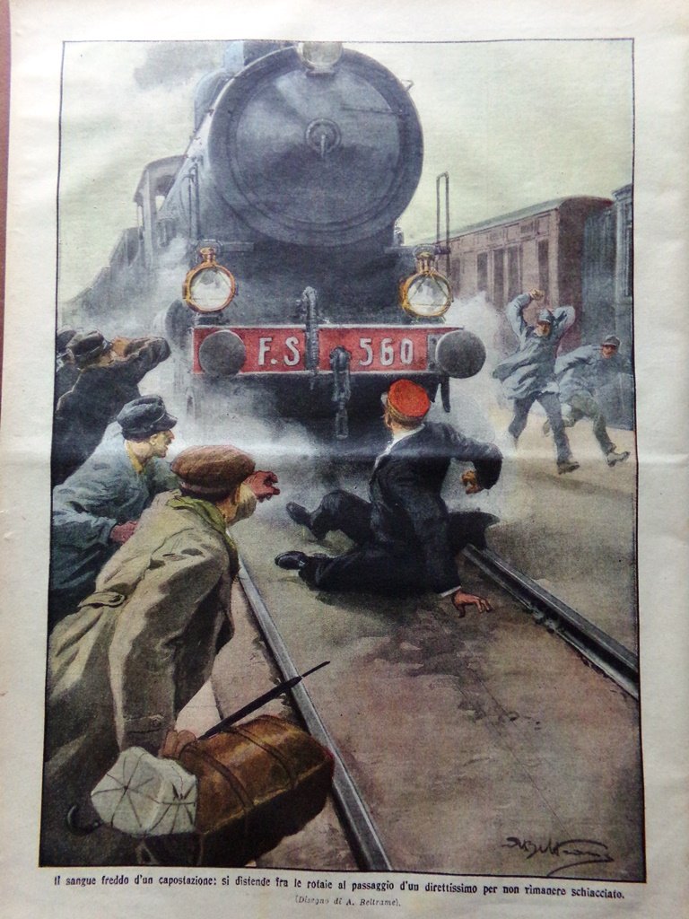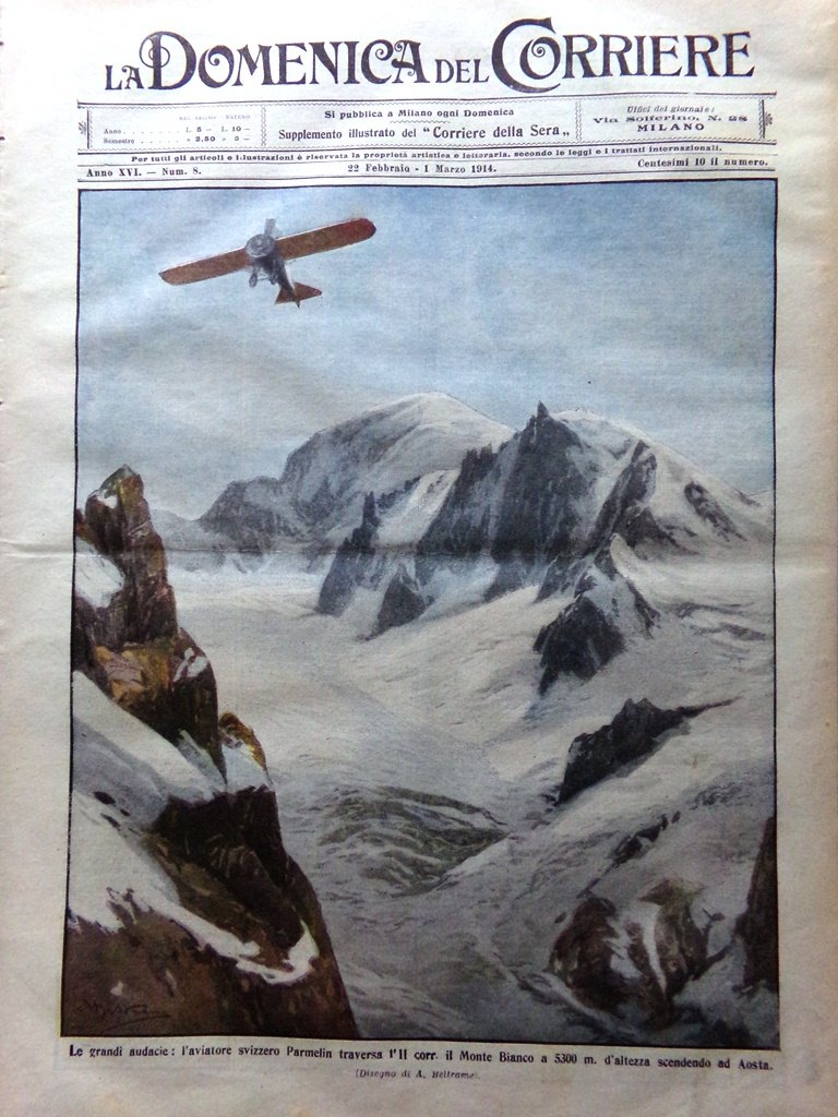 LA DOMENICA DEL CORRIERE Rivista Originale del 22 Febbraio 1914 Anno 16 nr. 8 pagine: 16 dimensioni: 38 x 28 cm IN PRIMA PAGINA: Le grandi audacie: l'aviatore svizzero Parmelin traversa l' 11 corr. il Monte Bianco a 5300 m. d'altezza scendendo ad Aosta (Achille Beltrame) NELL'ULTIMA PAGINA: Il sangue freddo di un capostazione: si distende fra le rotaie al passaggio di un direttissimo per non rimanere schiacciato (Achille Beltrame) ALL'INTERNO: La crisi dell'acqua in Sicilia Il quarto centenario della cioccolata Come fu trasformato un quadro di Carlo Dolci Il mitreo delle terme di Caracalla Bimbo che si fra dissanguare per un altro per la trasfusione di sangue La cattedrale dei Romanoff Una rivoluzione nella musica sognata da Edison CONDIZIONI DELLA RIVISTA: BUONE, NORMALI SEGNI DEL TEMPO, SOVRACOPERTINE MANCANTI NOTE PARTICOLARI: NESSUNA