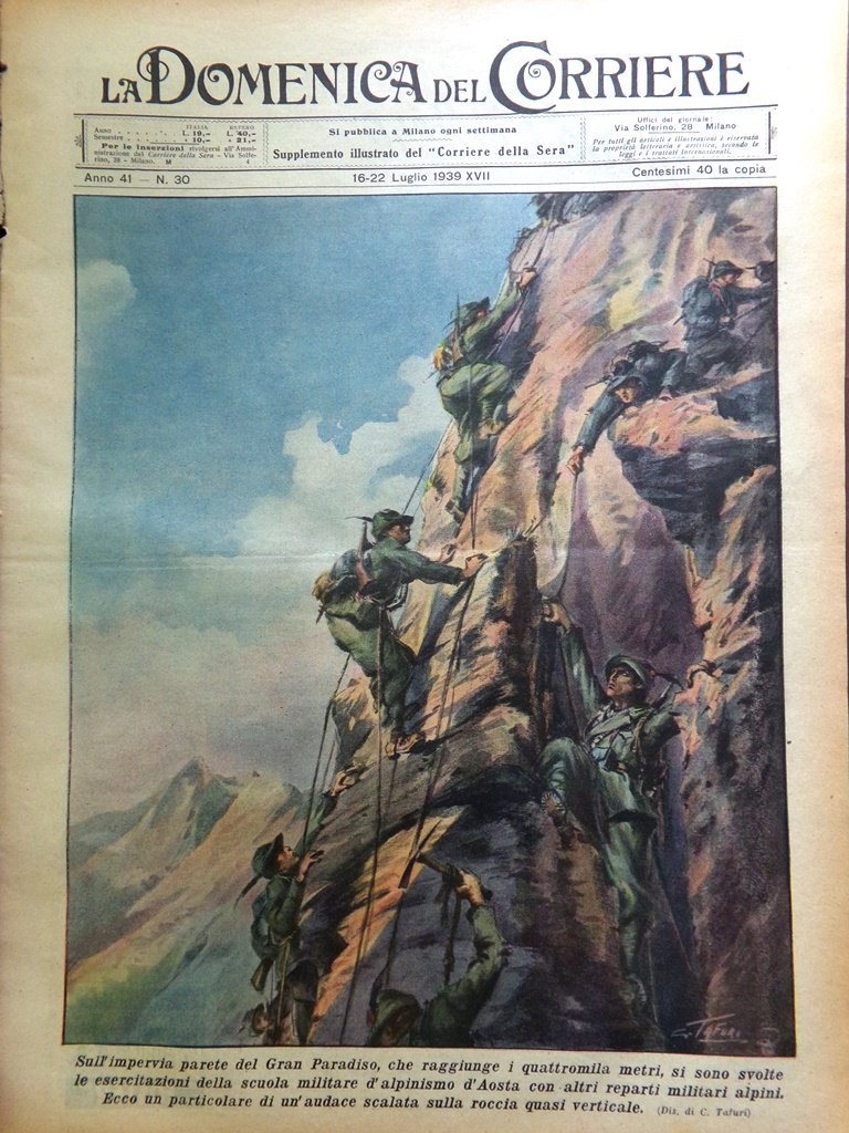 Sull'impervia parete del Gran Paradiso, che raggiunge i 4 mila metri, si sono svolte le esercitazioni della scuola militare d'alpinismo d'Aosta con altri reparti militari alpini. Ecco un particolare di un'audace scalata sulla roccia quasi verticale (Achille Beltrame)