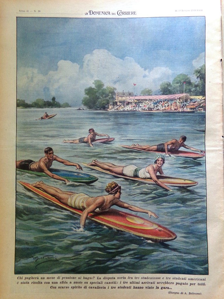 Chi pagher un mese di pensione ai bagni? La disputa sorta fra tre studentesse e tre studenti americani stata risolta con una sfida a nuoto su speciali canotti: i tre ultimi arrivati avrebbero pagato per tutti. Con scarso spirito di cavalleria i tre studenti hanno vinto la gara. (Achille Beltrame)
