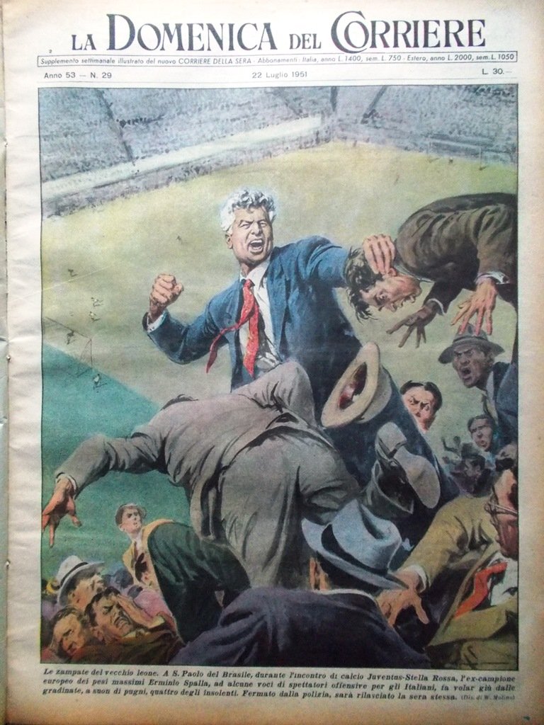 A San Paolo del Brasile durante l'incontro di calcio Juventus-Stella Rossa, l'ex campione europeo dei pesi massimi Erminio Spalla, ad alcune voci di spettatori offensive per gli italiani, fa volar giù dalle gradinate, a suon di pugni, quattro degli insolenti. Fermato dalla polizia sarà rilasciato la sera stessa (Walter Molino)