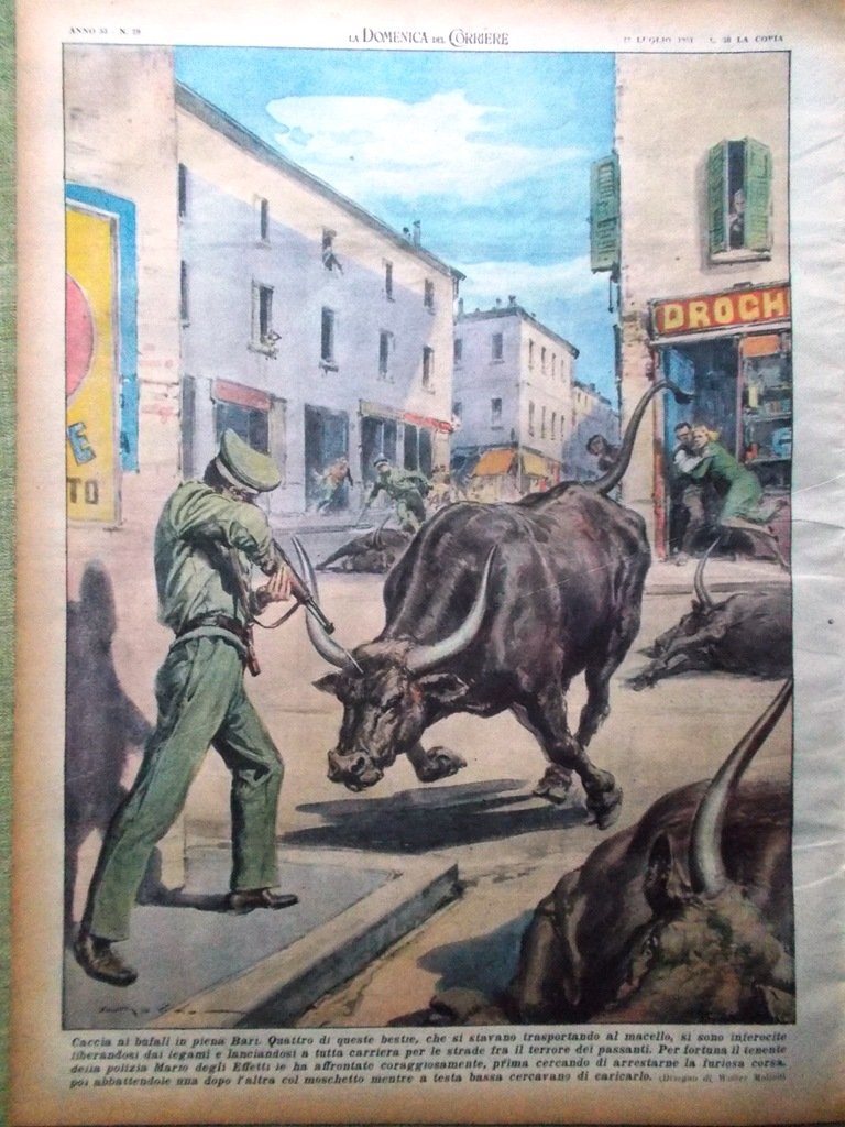 Caccia ai bufali in piena Bari. Quattro di queste bestie, che si stavano trasportando al macello, si sono inferocite liberandosi dai legami e lanciandosi a tutta carriera per le strade fra il terrore dei passanti. Per fortuna il tenente di polizia Mario degli Effetti le ha affrontate coraggiosamente, prima cercando di arrestarne la furiosa corsa, poi abbattendole una dopo l'altra (Walter Molino)
