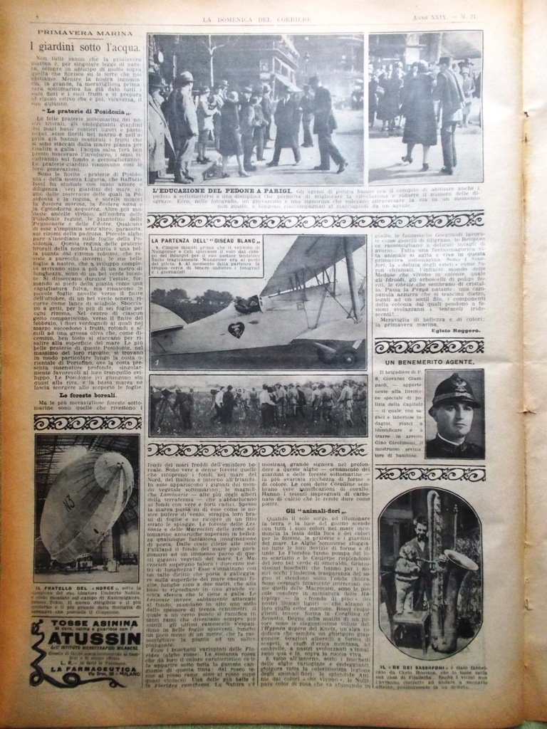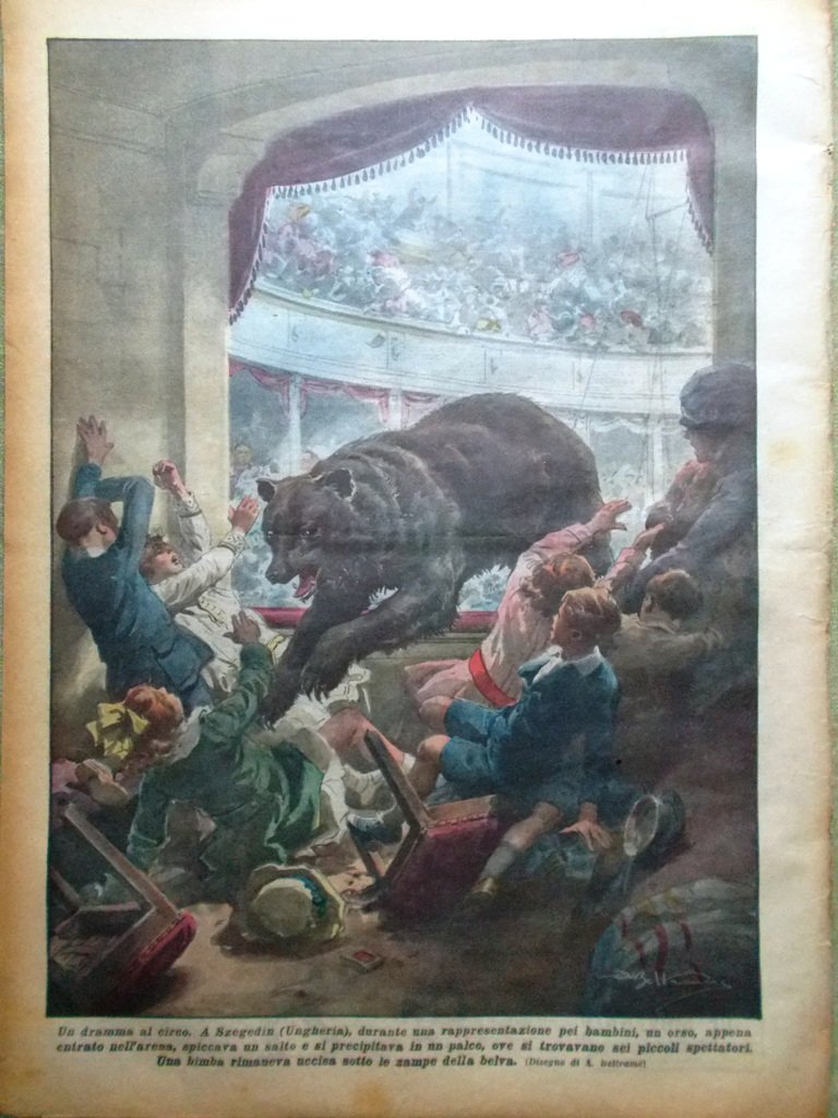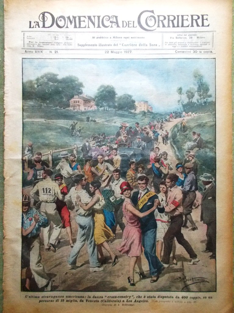 LA DOMENICA DEL CORRIERE Rivista Originale del 22 Maggio 1927 Anno 29 nr. 21 pagine: 16 dimensioni: 38 x 28 cm IN PRIMA PAGINA: L'ultima stravaganza americana: la danza "cross-country" che è stata disputata da 400 coppie, su un percorso di 15 miglia, da Venezia (California) a Los Angeles (Achille Beltrame) NELL'ULTIMA PAGINA: A Szegedin (Ungheria) durante una rappresentazione per bambini, un orso, appena entrato nell'arena, spiccava un salto e si precipitava in un palco uccidendo una bambina (Achille Beltrame) ALL'INTERNO: Il paradiso delle tigri nel Siam. La grande adunata di Siena per i fascisti. Avventure sul Mississippi. Il "faro della vittoria" sarà inaugurato a Trieste Georges Carpentier, dal ring alla ribalta. Giovanni Giampaoli un benemerito agente L'ingegnere italiano Bellanca Le curiosità delle poste e telegrafi: Costanzo Ciano, Giuseppe Pession. Il tesoro dei pirati di Trinidad CONDIZIONI DELLA RIVISTA: BUONE, NORMALI SEGNI DEL TEMPO, SOVRACOPERTINE MANCANTI NOTE PARTICOLARI: PICCOLO STRAPPETTO IN BASSO NELLA COPERTINA POSTERIORE