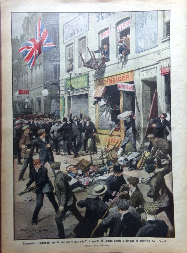 Commosso e indignato per la fine del "Lusitania", il popolo di Londra assale e devasta le proprietà dei tedeschi (Achille Beltrame)