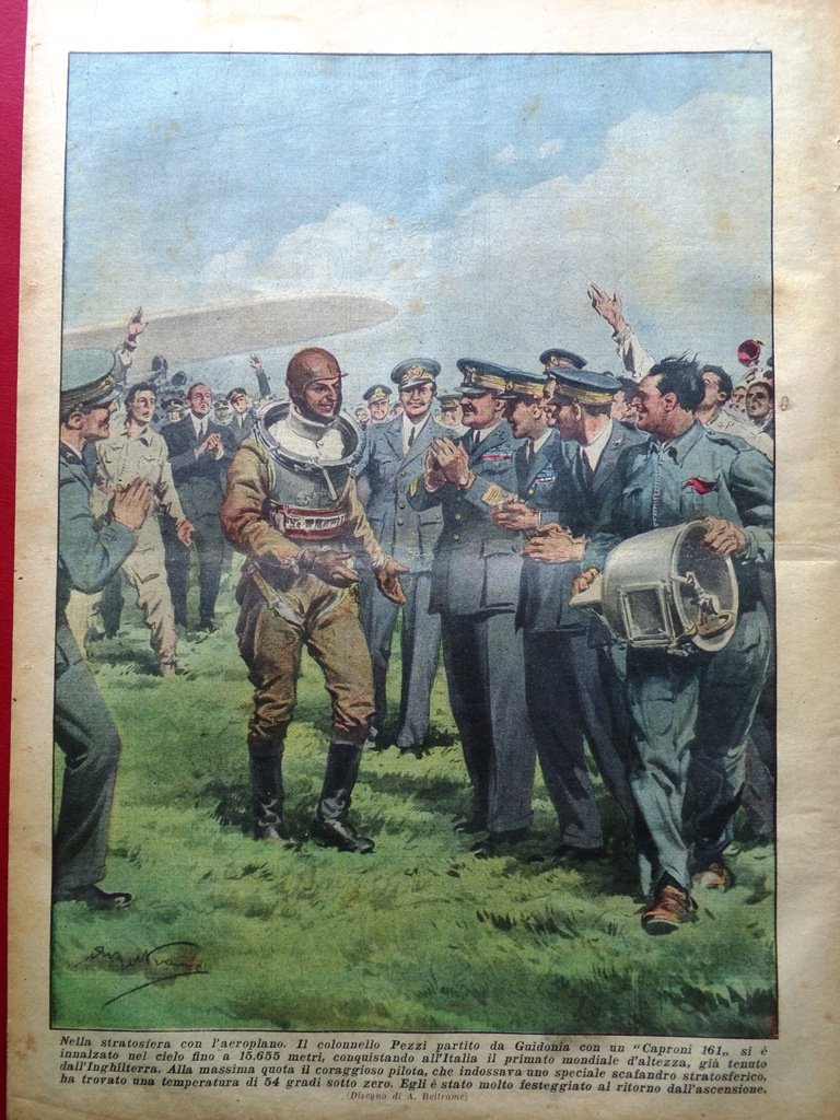 Nella stratosfera con l'aeroplano. Il colonnello Pezzi partito da Guidonia con una "Caproni 161" si è innalzato nel cielo fino a 15.655 metri conquistando all'Italia il primato mondiale d'altezza, già tenuto dall'Inghilterra (Achille Beltrame)