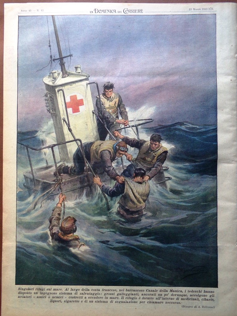Singolari rifugi sul mare. Al largo della costa francese, nel burrascoso Canale della Manica, i tedeschi hanno disposto un ingegnoso sistema di salvataggio: grossi galleggianti, ancorati un po' ovunque, accolgono gli aviatori costretti a scendere in mare. Il rifugio è fornito all'interno di medicinali, cibarie, liquori, sigarette e di un sistema di segnalazione per chiamare soccorso (Achille Beltrame)