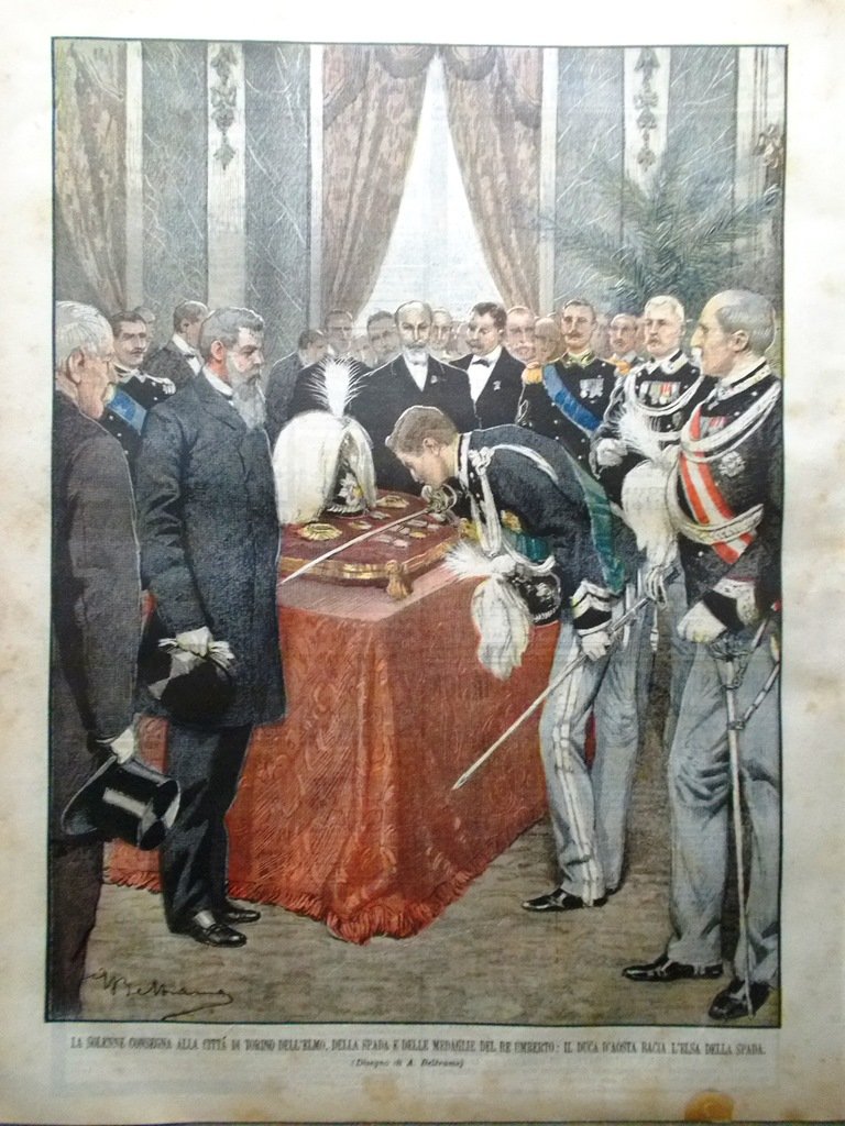 La solenne consegna alla città di Torino dell'elmo, della speda e delle medaglie del Re Umberto: il duca d'Aosta bacia l'elsa della spada (Achille Beltrame)