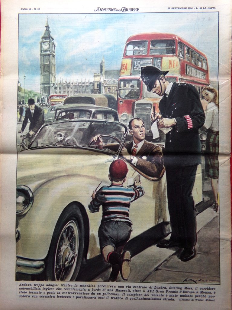 Mentre in macchina percorreva una via centrale di Londra, Stirling Moss, il corridore automobilista inglese che recentemente, a bordo di una Maserati, vinse il XVI Gran Premio d'Europa a Monza, è stato fermato e posto in contravvenzione da un policeman. Il campione del volante è stato multato perché procedeva con eccessiva lentezza e paralizzava così il traffico di quell'animatissima strada (disegno di Walter Molino)
