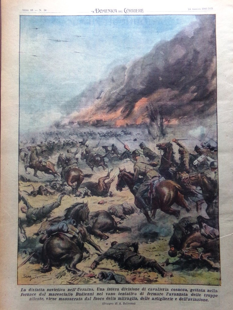 La disfatta sovietica nell'Ucraina. Una intera divisione di cavalleria cosacca, gettata nella fornace dal maresciallo Budienni nel vano tentativo di fermare l'avanzata delle truppe alleate, viene massacrata dal fuoco della mitraglia, delle artiglierie e dell'aviazione (Achille Beltrame)